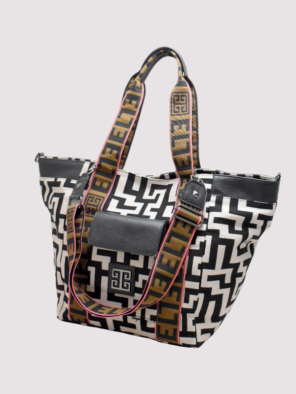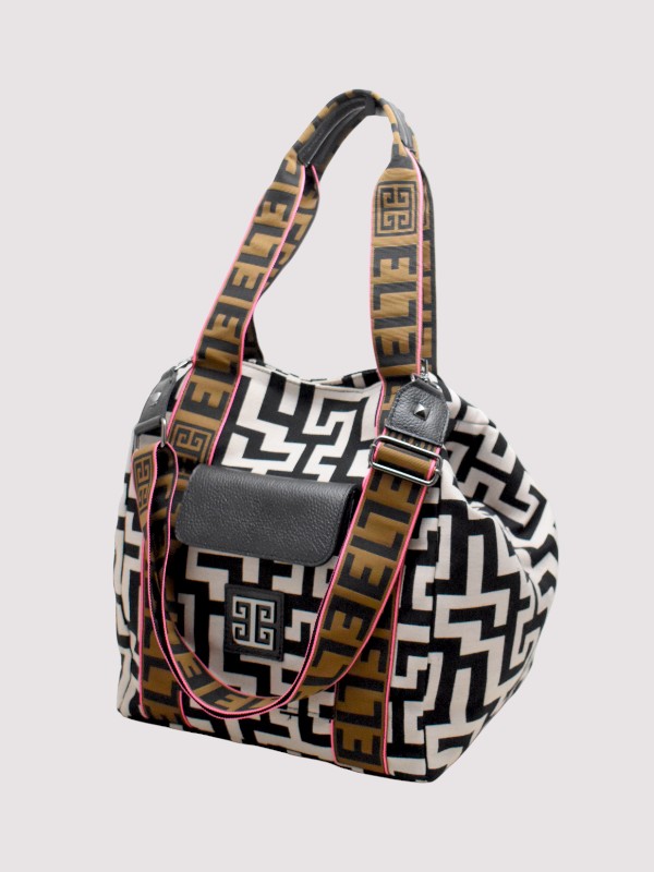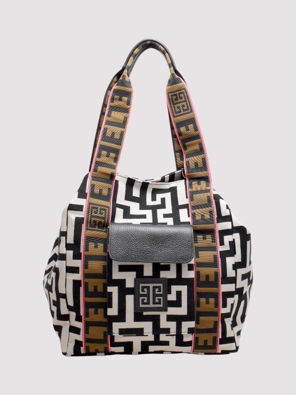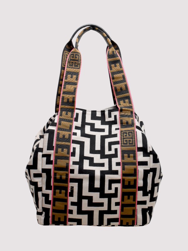 AVRA – CLASSIC Pattern – Ecru Black – EL Brown/Black/Pink Strap – Shoulder Bag