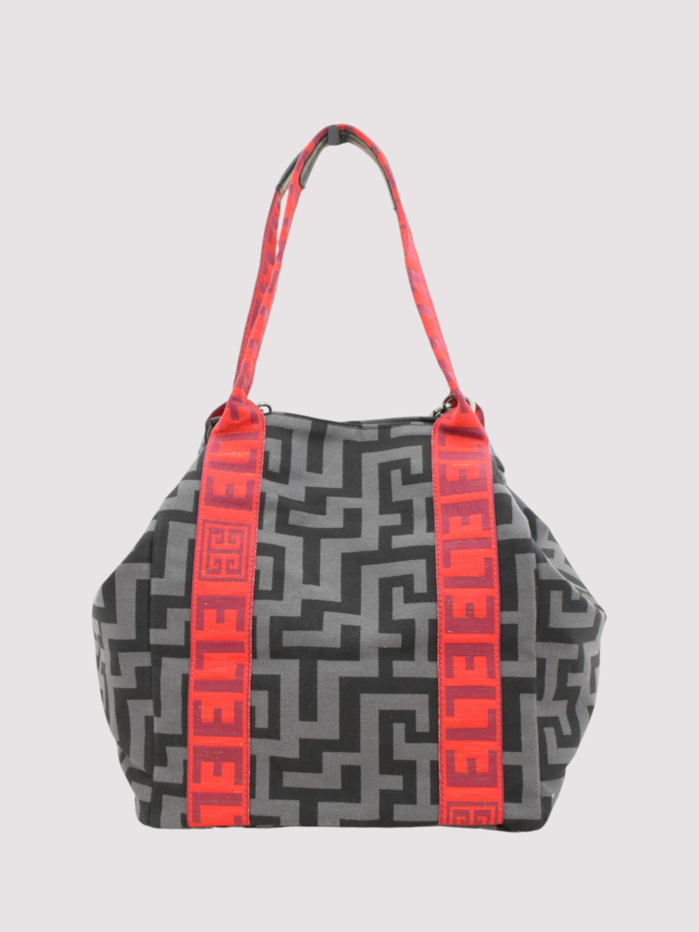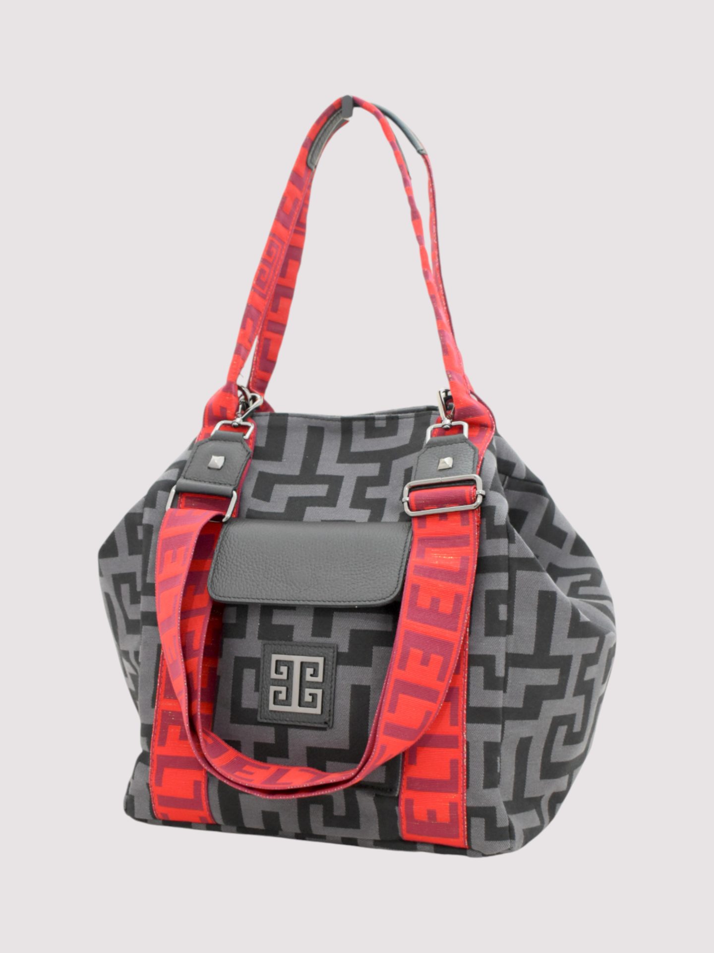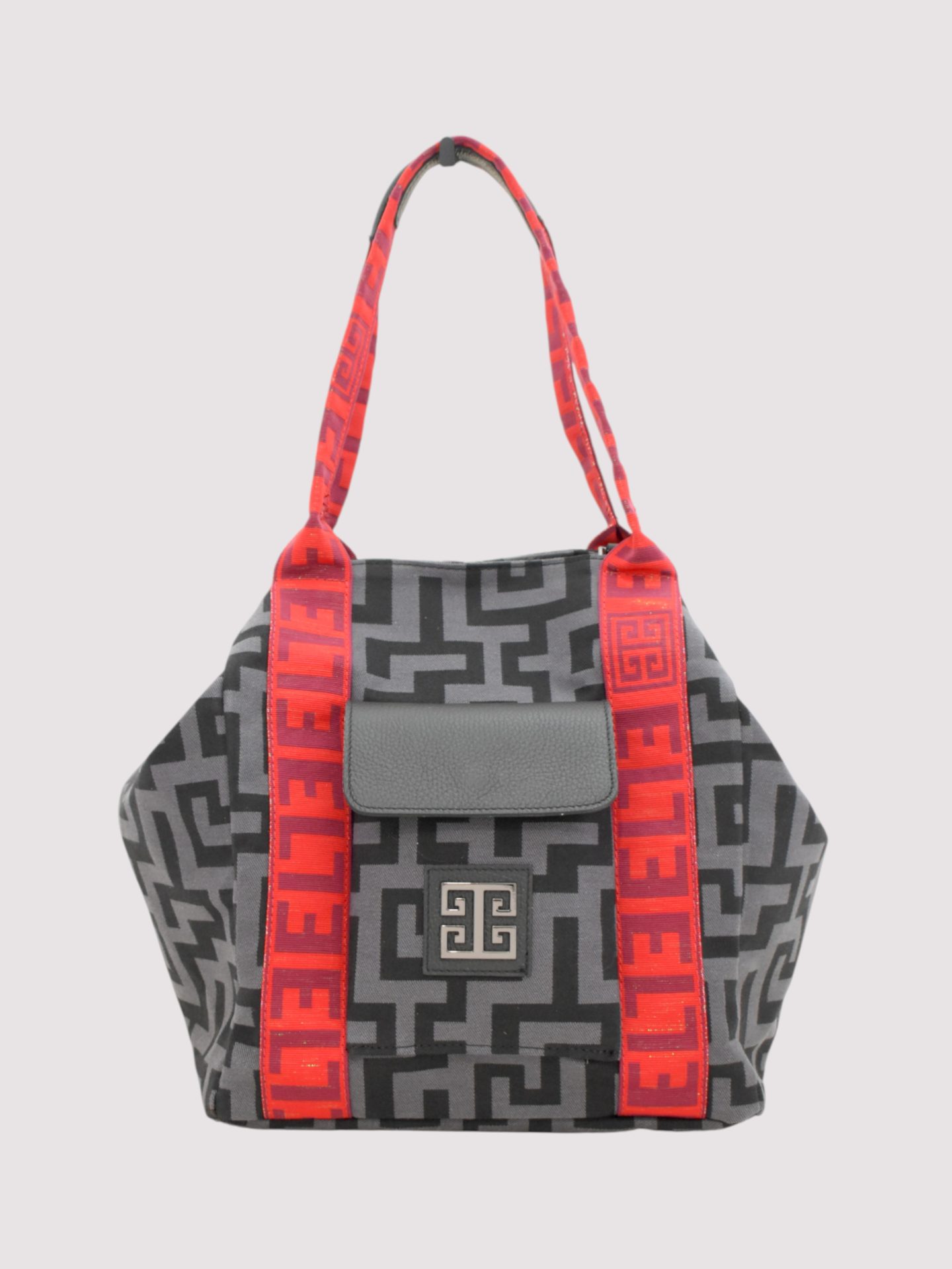 AVRA – CLASSIC Pattern – Grey/Black – EL Strap Red/Plum – Shoulder Bag