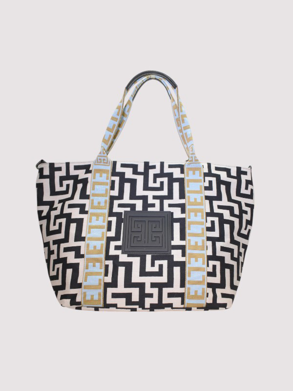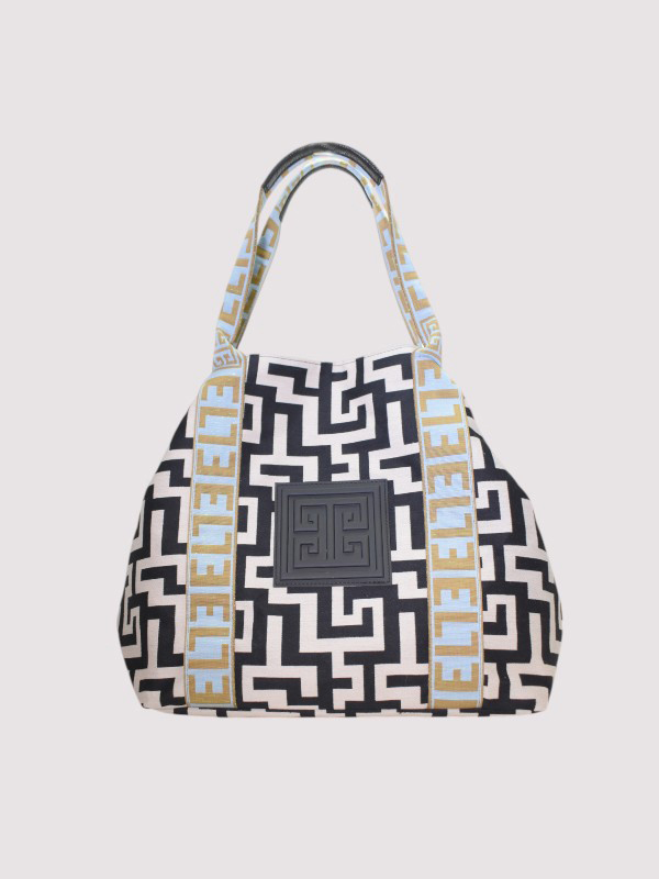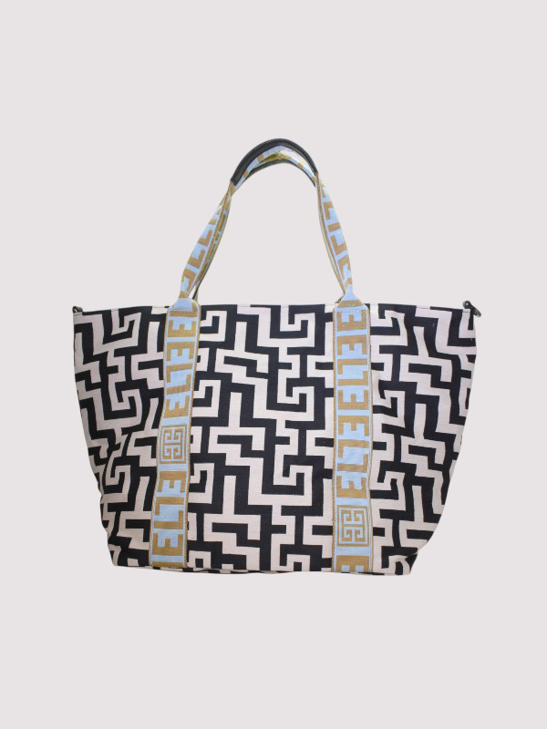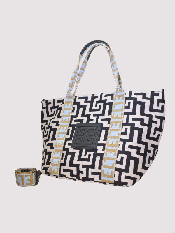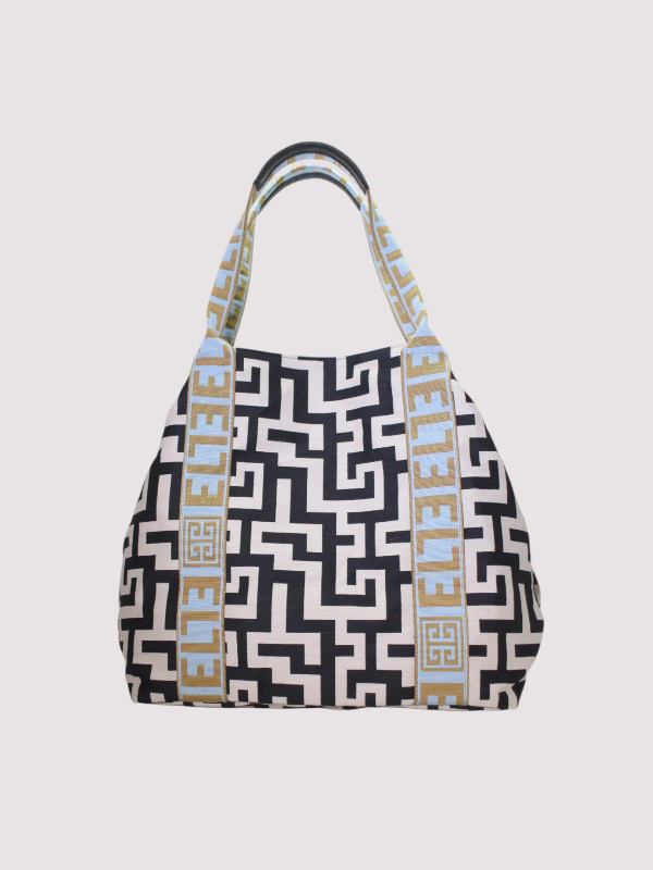 THALASSA – CLASSIC Pattern – Ecru/Black – EL Baby Blue/Tan Strap – Shoulder Bag