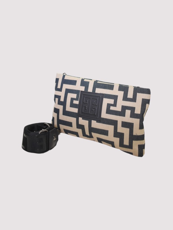 LINA – CLASSIC Pattern – Μπεζ/Μαύρο – EL 3D Glossy Ιμάντας – Τσάντα Χιαστί